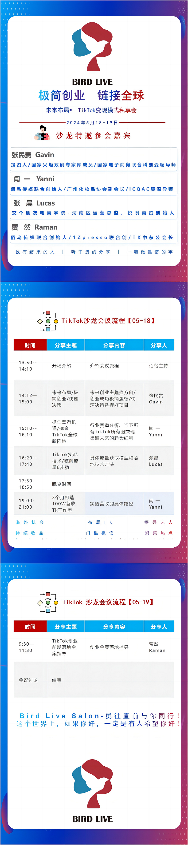 TikToK作为有着中国背景的社交网络平台,凭借41亿下载量和17亿的月活用户体量,为市场带来了新的红利和机会,2024年TikTok流量红利持续增长,越来越多的明星、网红、商家转战TikTok新主场,本次沙龙以“出海新风口 掘金新赛道”为主题,从TikTok商业进程,发展现状、趋势机会及入局领域等方面做详细分享,佰鸟用四年实战经验,用“极简创业”思维模型,帮助及带领伙伴们快速打开TikTok流量大门,开启变现3.0掘金之路。