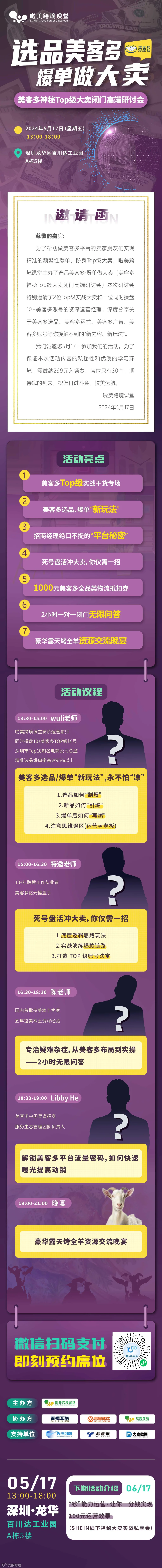 本次研讨会特别邀请了2位Top级实战大卖和一位同时操盘10 美客多TOP级账号的资深运营经理,深度分享关干美客多选品、美美客多运营、美客多广告、美客多账号等你接触不到的“新内容、新玩法”。