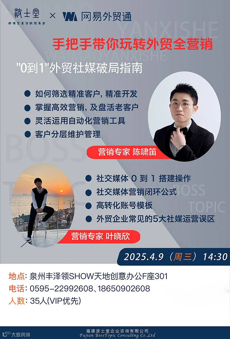 福建波士堂企业咨询有限公司是一家专业的跨境贸易咨询服务机构,主要为出口型企业提供一站式的海外营销解决方案,以及提供领先的品牌设计、内容创意及数字营销。通过跨境贸易渠道的整合营销及社交媒体新赛道的赋能,为更多优质的中小企业带来一体化的互联网数智化营销服务,帮助企业在人工智能时代利用大数据分析进行精准营销,实现全球化布局。致力于成为中国跨境贸易咨询领导者。