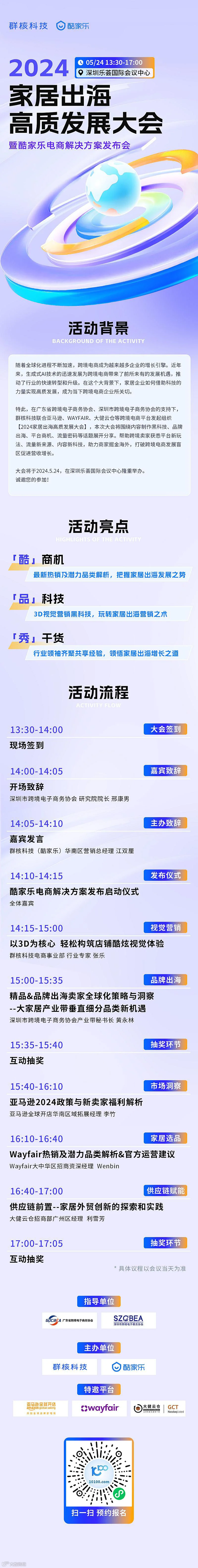 5月24日,在广东省跨境电子商务协会、深圳市跨境电子商务协会的支持下,群核科技(酷家乐)联合亚马逊、WAYFAIR、大健云仓等跨境电商平台发起「2024家居出海高质发展大会」,助力商家出海掘金!