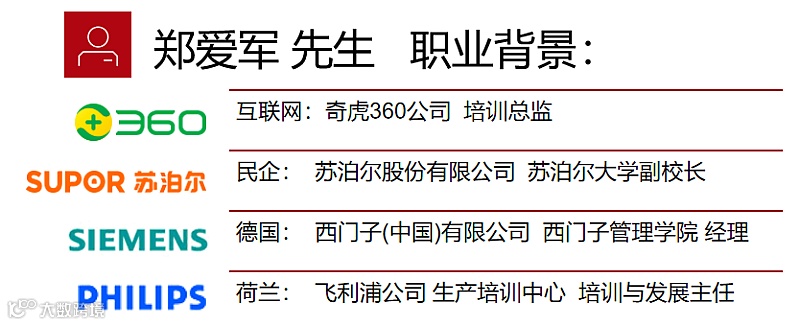 郑老师28年的工作经历中,跨越互联网公司奇虎360和传统行业如西门子,飞利浦和民企苏泊尔,从事过制造管理,生产计划,培训,人力资源等众多岗位。作为从传统企业转型互联网公司的亲身经历者。德国公司的工作经历让他养成了严谨求实,逻辑体系的思考风格, 互联网公司的工作经历让他养成了用户至上,创新求变的行为方式。
