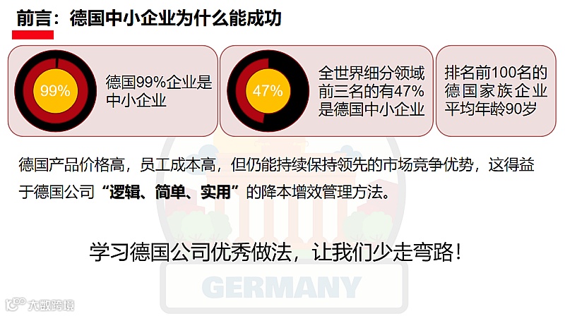本次课程借鉴德国公司经验,认为管理者是降本增效第一责任人,强调以客户为中心,通过管理工具方法,降本增效,全员参与,持续改进。