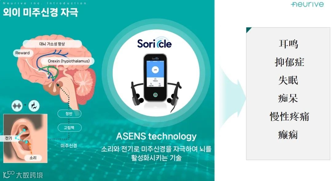 公司核心产品,是一款个人用迷走神经刺激(VNS)医疗设备,通过电刺激和声音刺激技术(ASENS Technology)治疗耳鸣和失眠,已被多项国际研究证明有效。Soricle采用易于佩戴的耳塞式设计,适合老年患者使用,并正在申请个人医疗设备许可,预计将在2025年获得批准