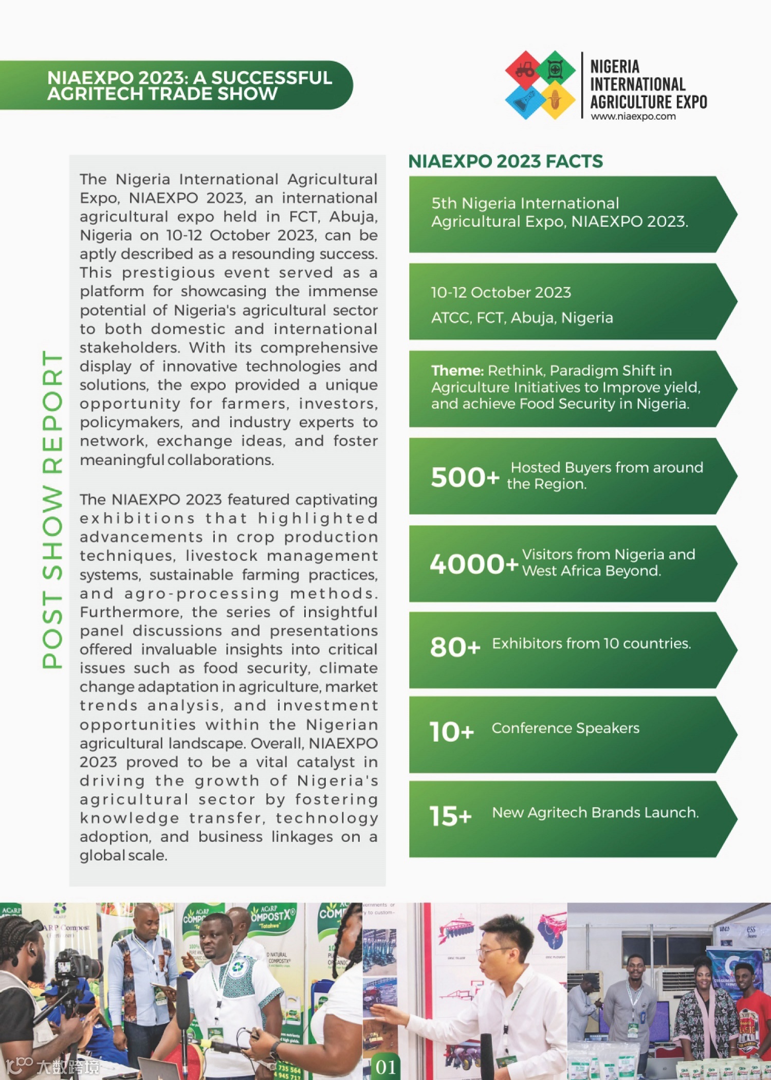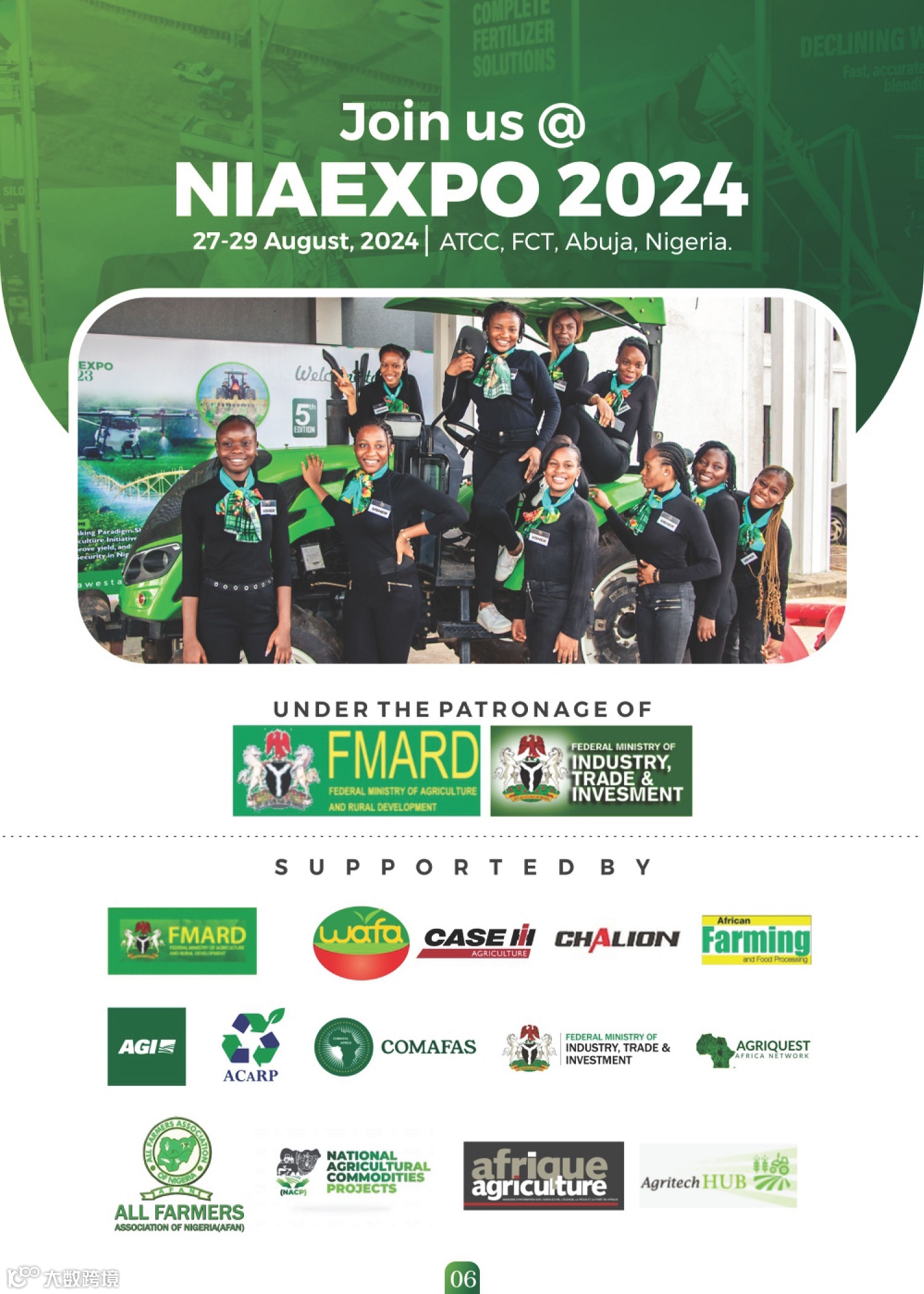日利亚国际农业博览会NIAExpo主题:智慧农业技术的新领域,以促进西非的经济发展和粮食安全。这是一年一度的贸易、展览和峰会活动,将展示、讨论这个充满活力的地区农业发展和投资的潜力、成功和前进方向,并提出建设性的前进方向。