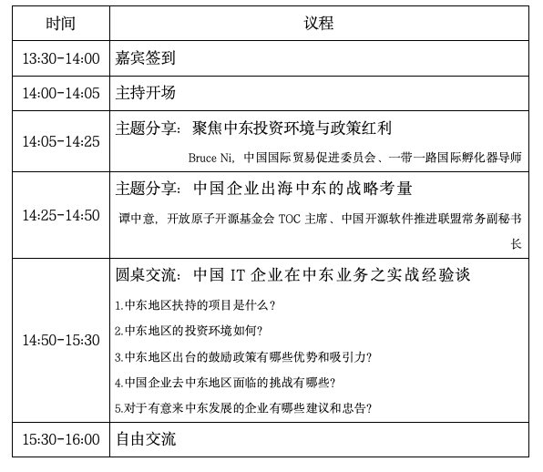 在此背景下,为助力我国更多科技企业及科技工作者踏浪中东、成功出海,北京长风信息技术产业联盟计划举办一场线下交流座谈会,中外嘉宾将以“主题报告+交流对话”的形式,分享中国企业出海中东的机遇与挑战、中东政策的优势和吸引力等,为我国企业出海中东提供切实帮助。