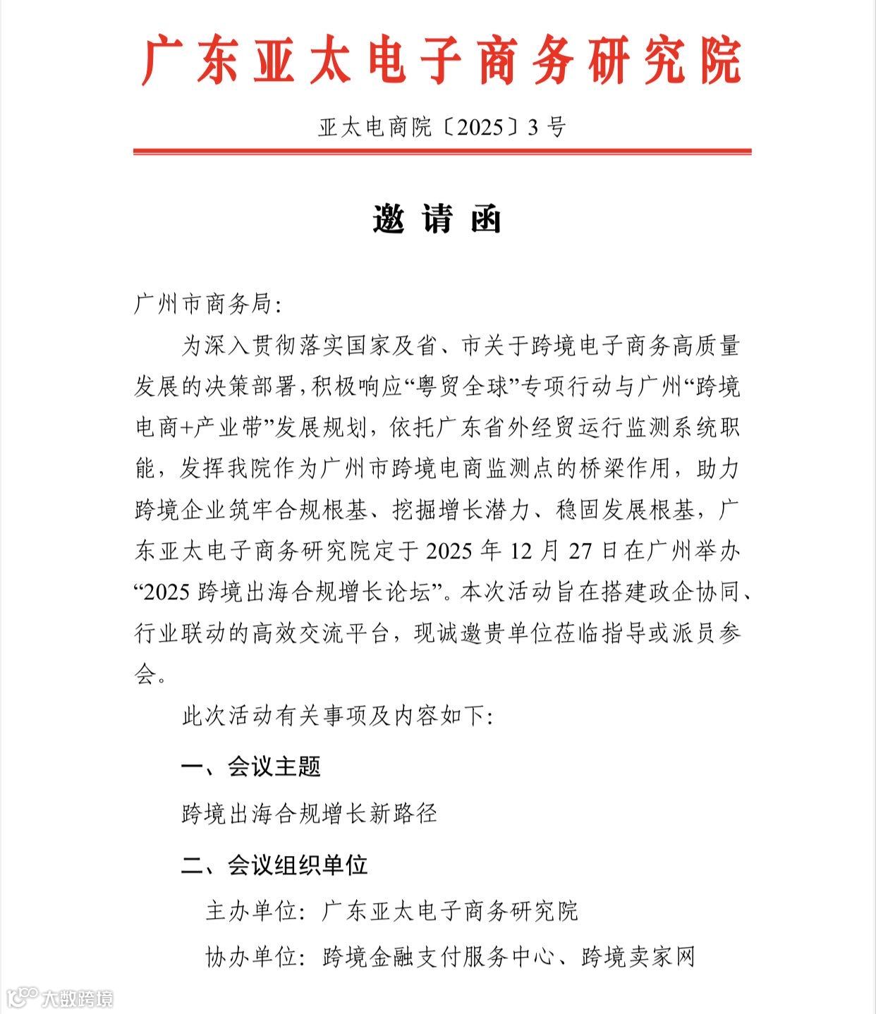 为深入贯彻落实国家及省、市关于跨境电子商务高质量发展的决策部署,积极响应“粤贸全球”专项行动,充分发挥广东亚太电子商务研究院作为广东省商务厅跨境电商监测点的桥梁纽带作用,助力跨境企业筑牢合规根基、挖掘增长潜力,推动行业高质量发展,由我院主办的“2026跨境出海合规增长论坛”(作为“2025大湾区物流与供应链学术年会”分论坛)定于2025年12月27日在广州南沙隆重举办。
