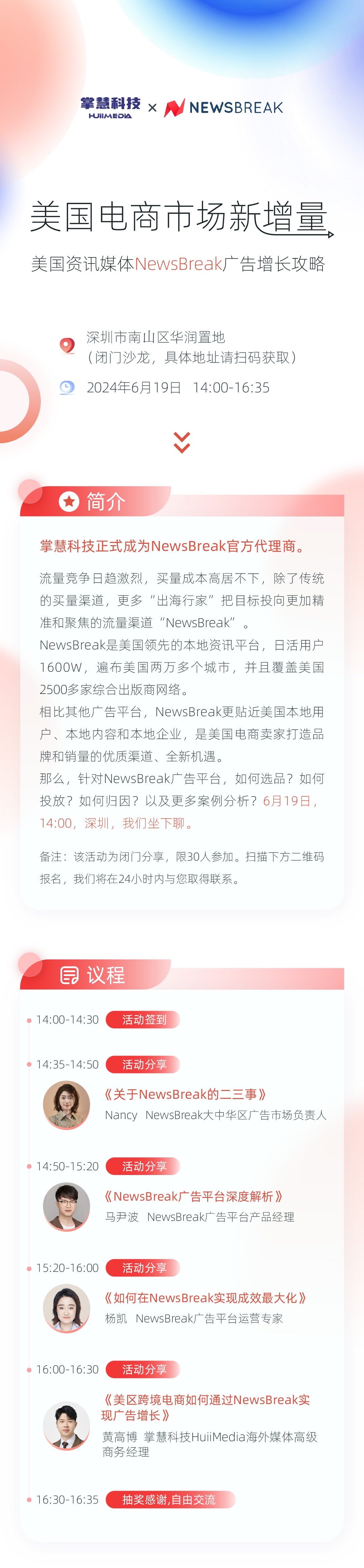 现场将邀请NewsBreak大中华区广告市场负责人 Nancy、广告平台产品经理马尹波,广告平台运营专家杨凯、掌慧科技HuiiMeida海外媒介高级商务经理黄高博,以及多位美区电商大卖分享、交流。