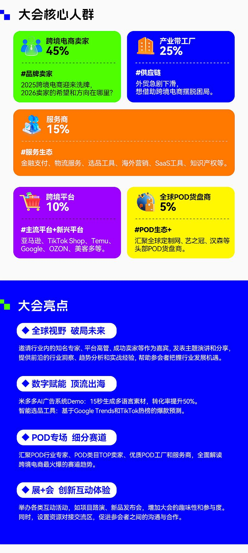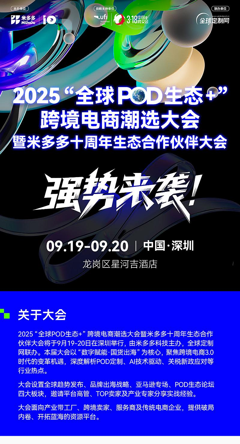 2025“全球POD生态+" 跨境电商潮选大会暨米多多十周年生态合作伙伴大会将于9月19-20日在深圳举行,由米多多科技主办。本届大会以 “数字赋能·国货出海” 为核心,聚焦 跨境电商3.0时代的变革机遇,深度解析POD定制、AI技术驱动、关税新政应对等行业热点。大会设置全球趋势发布、品牌出海战略、亚马逊专场、POD生态论坛四大板块,邀请平台高管、TOP卖家及产业专家分享实战经验。大会面向产业带工厂、跨境卖家、服务商及传统电商企业,提供破局内卷、开拓蓝海的资源平台。
