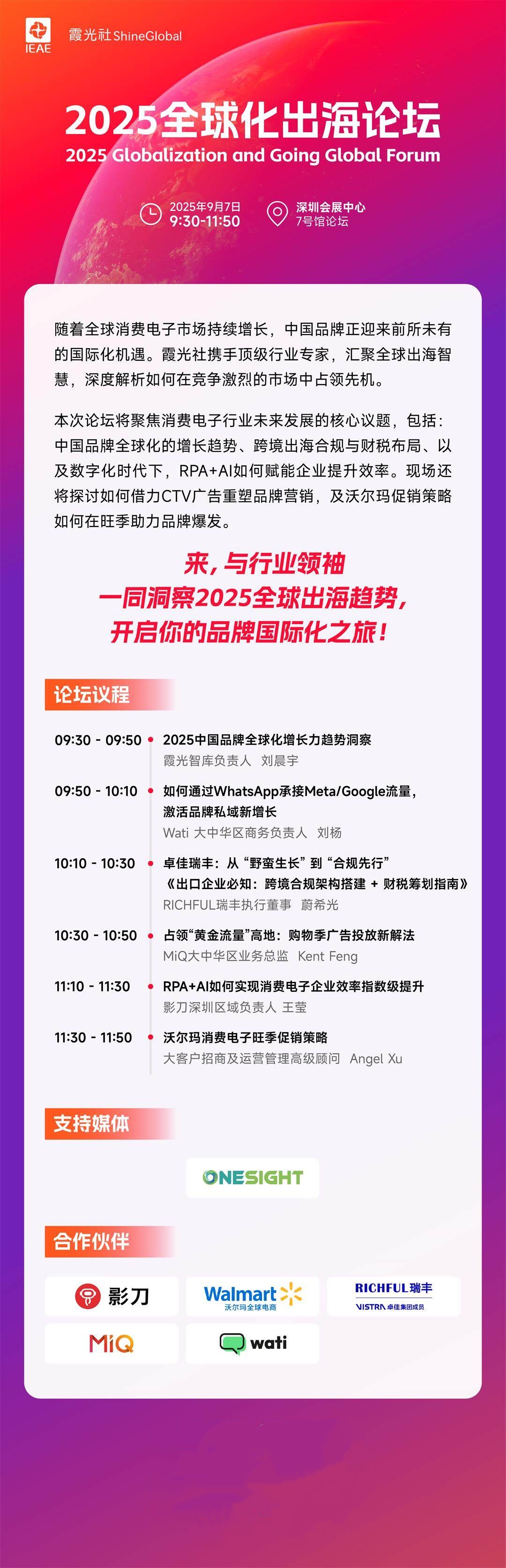 本次论坛将聚焦消费电子行业未来发展的核心议题,包括:中国品牌全球化的增长趋势、跨境出海合规与财税布局、以及数字化时代下,RPA+AI如何赋能企业提升效率。现场还将探讨如何借力CTV广告重塑品牌营销,及沃尔玛促销策略如何在旺季助力品牌爆发。
