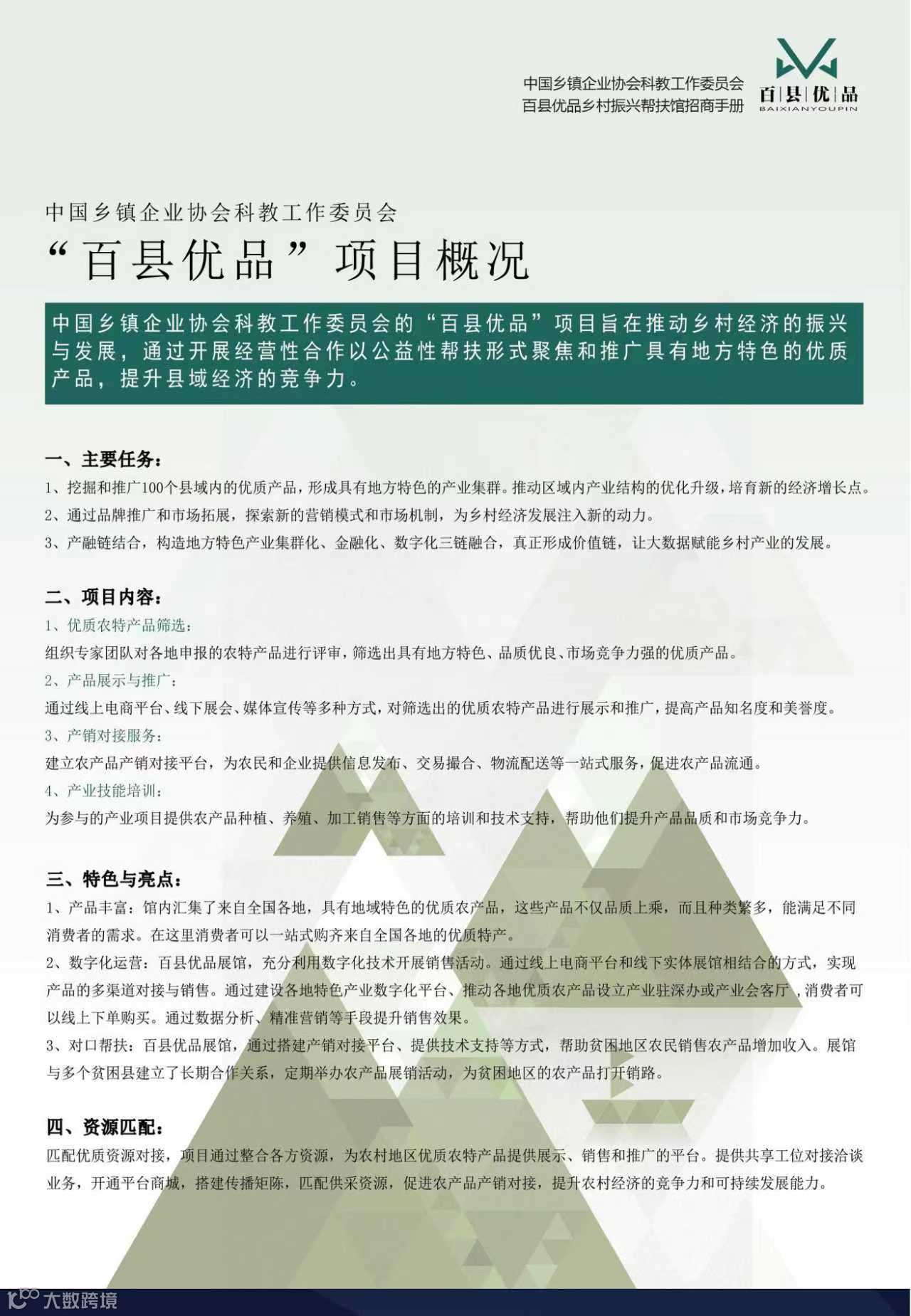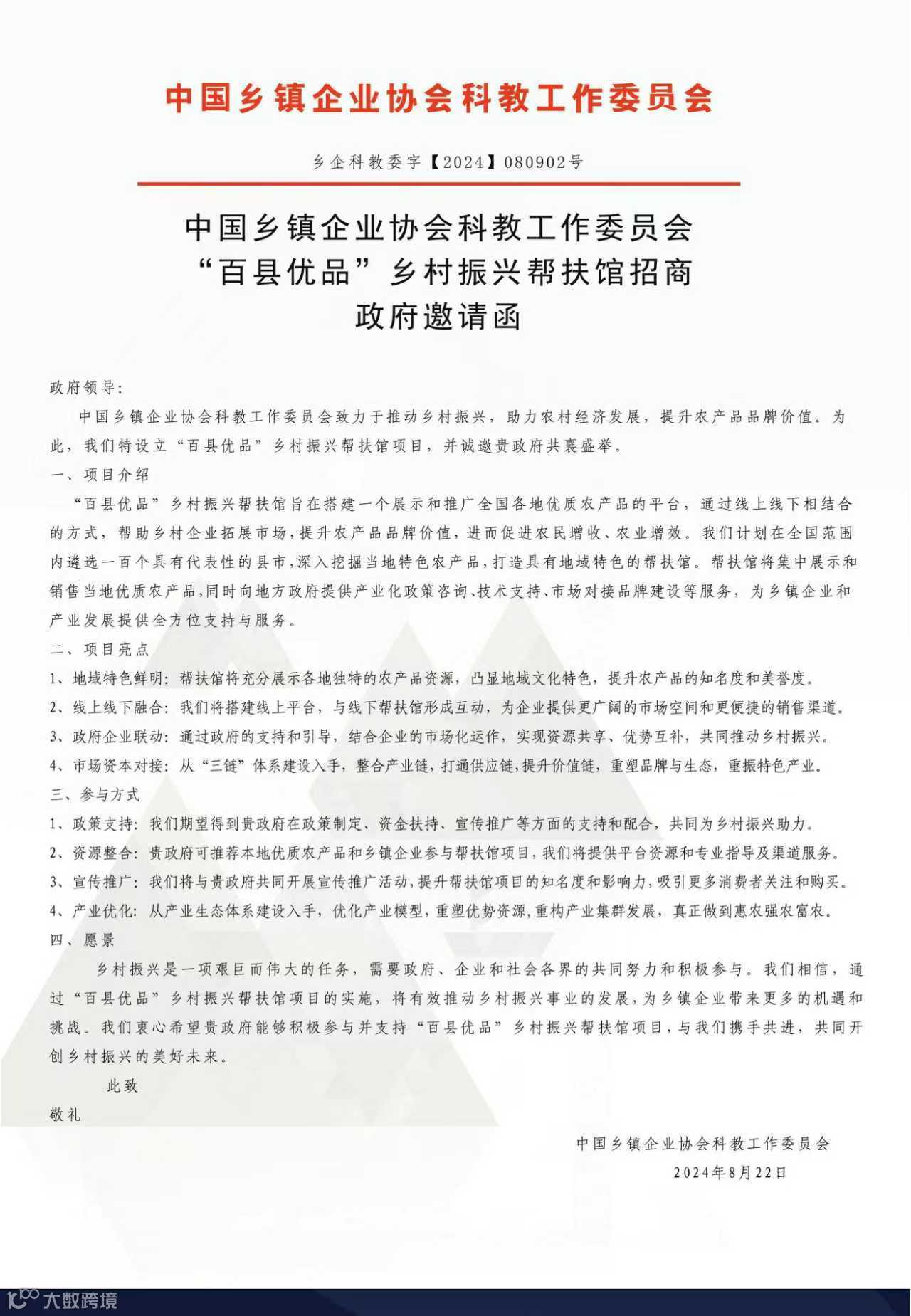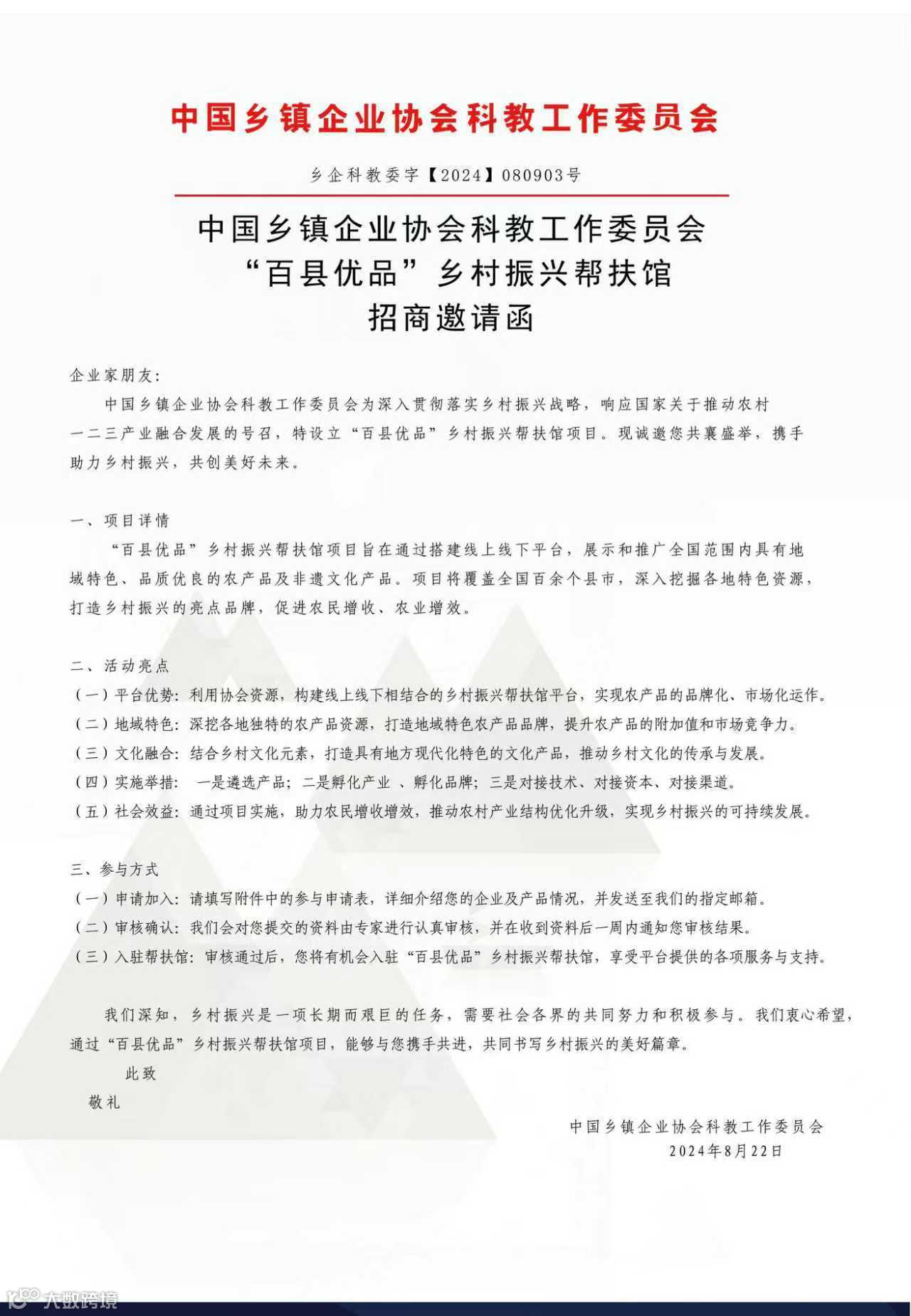 您好!我们诚挚邀请您参加在中国乡镇企业协会指导下,中国乡镇企业协会科教工作委员会承办的“百县百品”沙龙活动。本次交流会将重点介绍来自全国各地的优质产品,涵盖健康食品、保健品、天然饮品等多个品类。我们将邀请行业专家、品牌代表和消费者共同探
