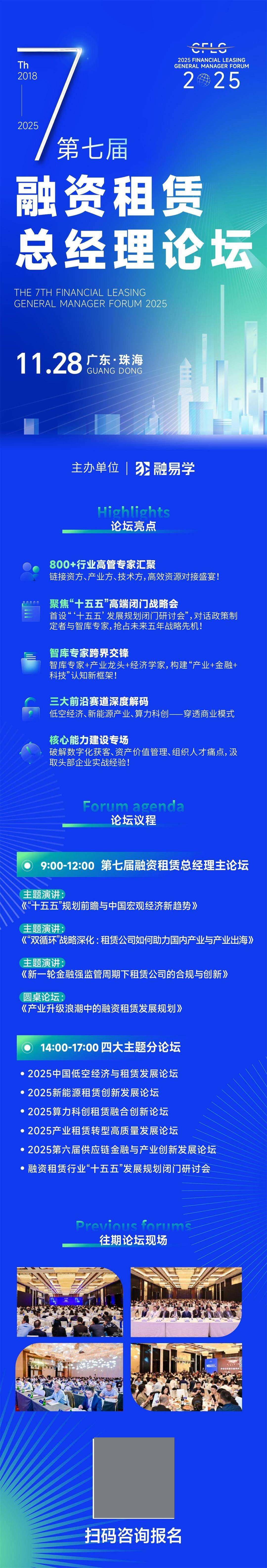 2025年,机遇与挑战并存!第七届融资租赁总经理论坛即将盛大开幕,携手行业顶尖专家、产业龙头与政策制定者,共同开启一场“产业+金融+科技”的深度对话与实践盛宴!