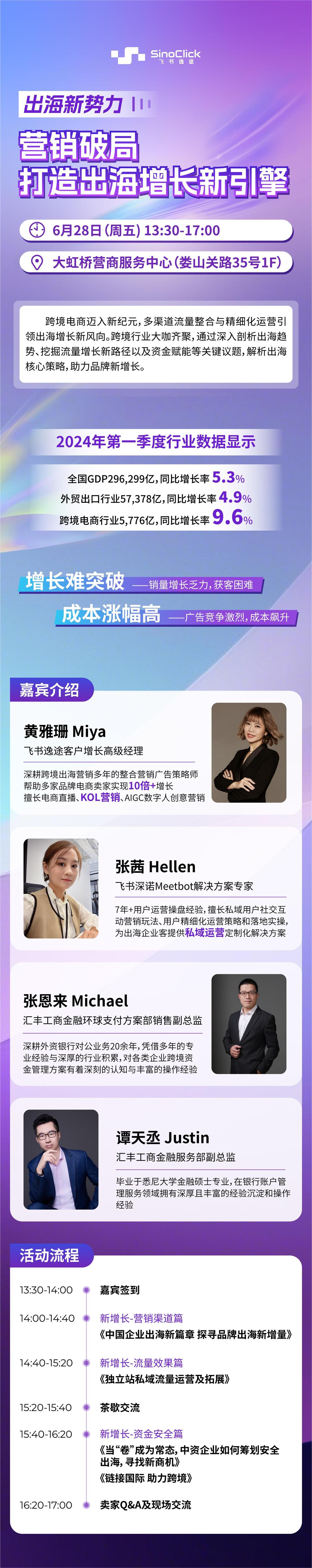 跨境电商迈入新纪元,多渠道流量整合与精细化运营引领品牌出海增长新潮流。在全球市场瞬息万变的背景下,流量成本上涨较快、销量增长遭遇瓶颈成为共同话题。为推动中国出海企业可持续增长,本次活动集结跨境行业精英,共同探讨品牌出海新动向。通过深入剖析趋势、重塑品牌定位、挖掘流量增长新路径、以及资金赋能等关键议题,揭示中国品牌出海的核心策略,助力出海品牌新增长。