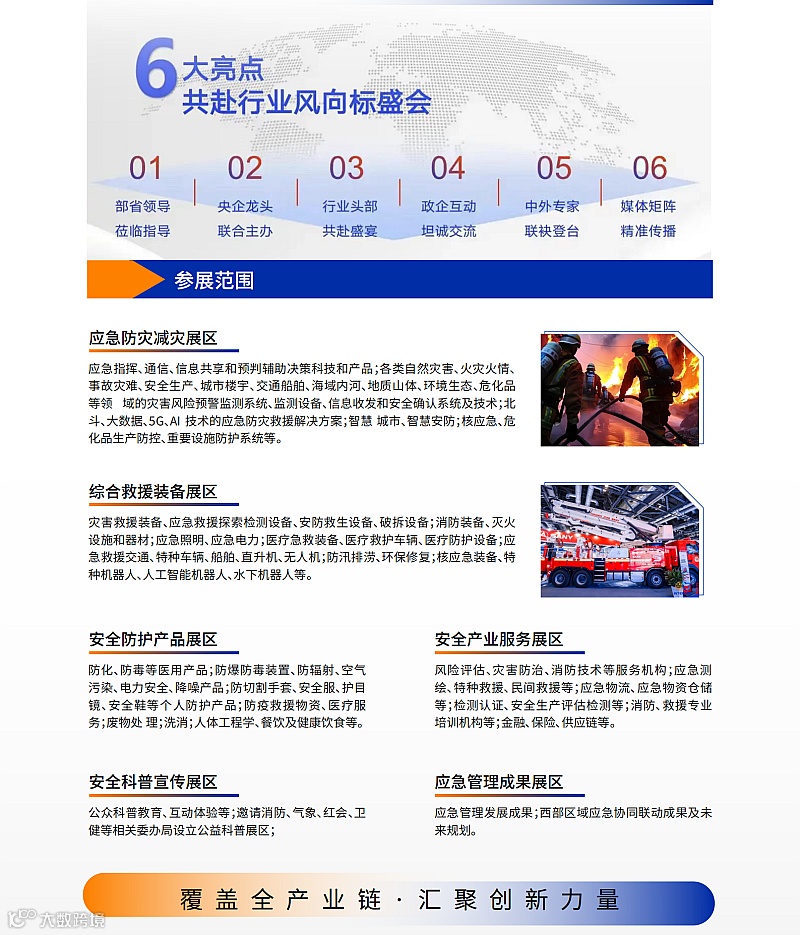 此次博览会面向国家应急重点项目及工信部、应急部和四川省2024揭榜挂帅项目需求,在此,中国灾害防御协会诚挚邀请各高等院校、科研院所、高科技公司的新技术、新材料、新方法、新装备等,应用于灾害救援和安全生产领域的“空天地海”先进技术装备及实战化验证的应急产品参加此次应急展,为国家应急救援工作提供技术支撑保障。本届博览会充分听取各方建议,进一步优化展区规划,积极提质扩容,愿与各界携手,共同打造高品质、高规格、多层次、强创新的行业盛会。