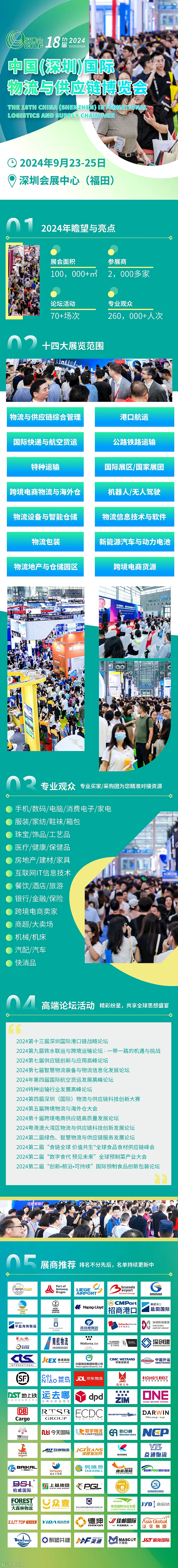 ◆物流与供应链综合管理、◆港口航运、◆国际快递与航空货运、◆公路铁路运输、◆特种运输、◆国际展区/国家展团、◆跨境电商物流与海外仓、◆物流设备与智能仓储、◆物流信息技术与软件、◆物流包装、◆新能源汽车与动力电池、◆物流地产与仓储园区、◆机器人/无人驾驶、◆跨境货源