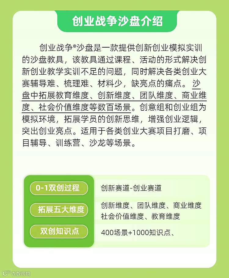 致力为创业者提供系统的创业学习模拟实训环境解决方案,推动创业者成长,为创业者提供从创意到融资多个阶段工具化、系统化的快速模拟推演课程与产品。历时八年为创业者开发设计了多个品牌创业课程如:初创模拟沙盘、创业运营沙盘、创业营销沙盘、创业融资沙盘、创业教练工具包等,拥有八年2000家多单位丰富的授课经验。开发的创业实训沙盘工具在各单位应用中年培训学员超过100万人次,年培训创业师资2000人以上,年参与创业孵化企业辅导数百家。