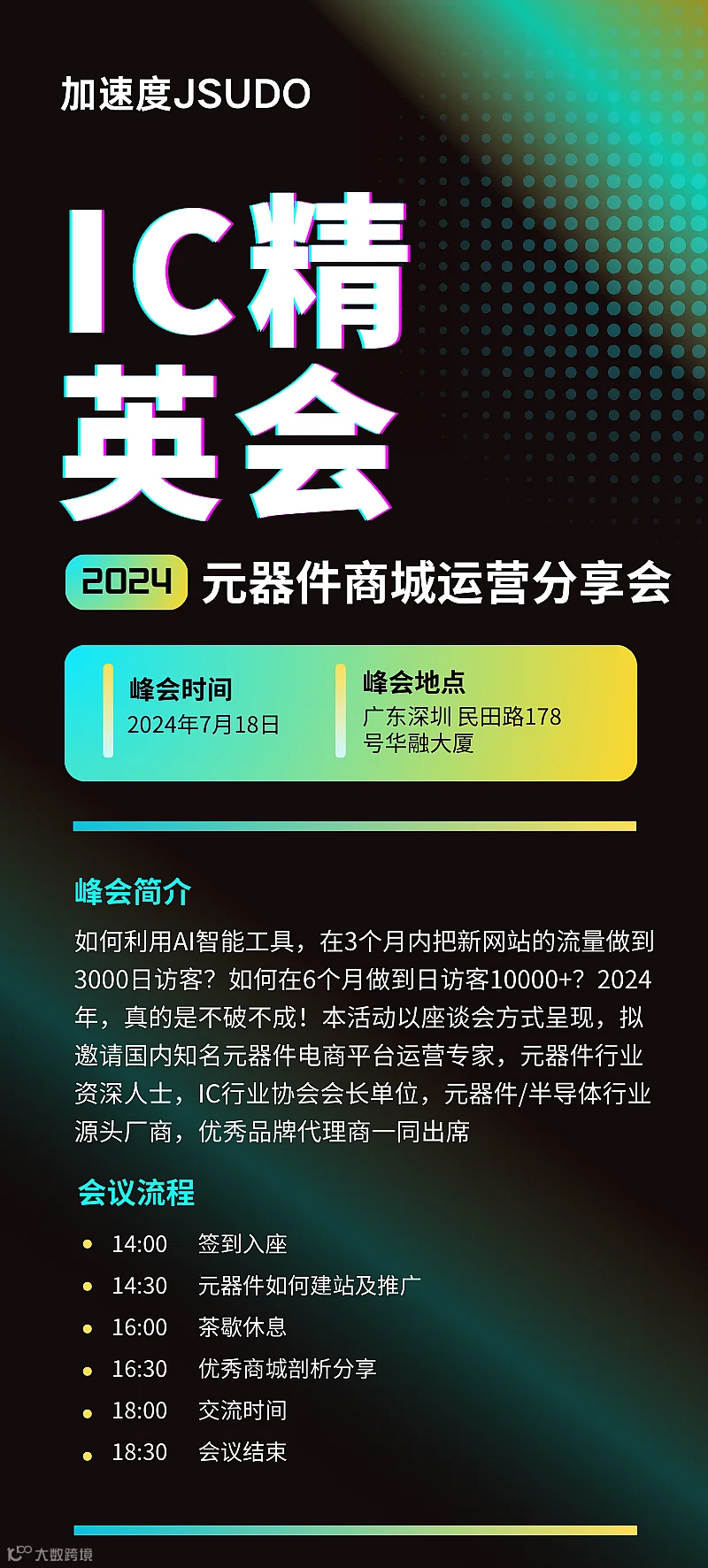 如何利用AI这类智能工具,在3个月内把新网站的流量做到3000日访客?如何在6个月做到日访客10000+?2024年,真的是不破不成!本活动以座谈会方式呈现,拟邀请国内知名元器件电商平台运营专家,元器件行业资深人士,IC行业协会会长单位,元器件/半导体行业源头厂商,优秀品牌代理商一同出席,受邀单位包括不限于以下名单:
