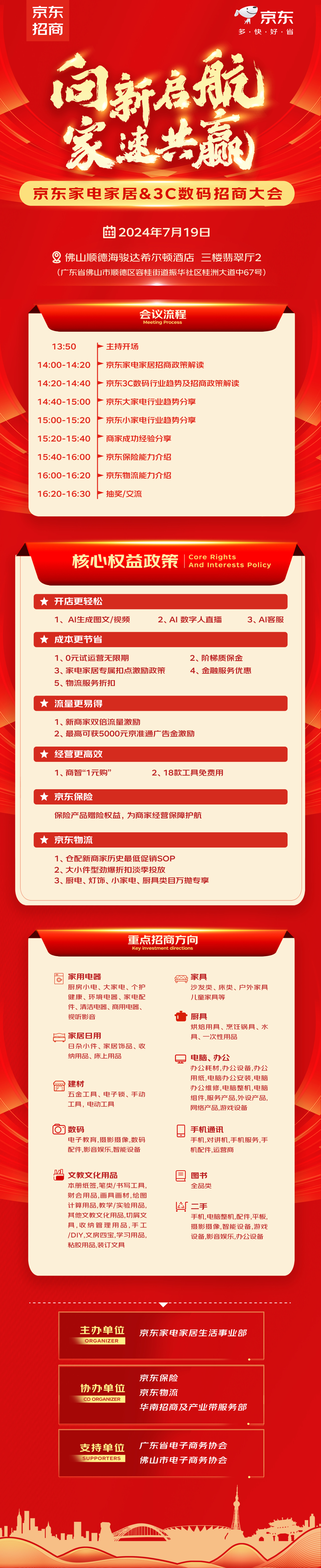 由京东家电家居生活事业部主办,我会支持的“向新启航·家速共赢”——京东家电家居&3C数码招商大会将于7月19日在佛山举办大型行业趋势洞察发布会,诚邀各位商家朋友莅临参与。