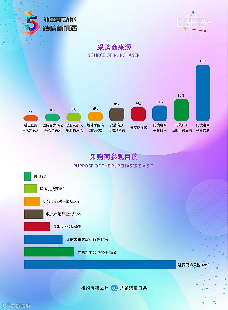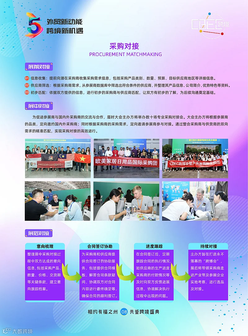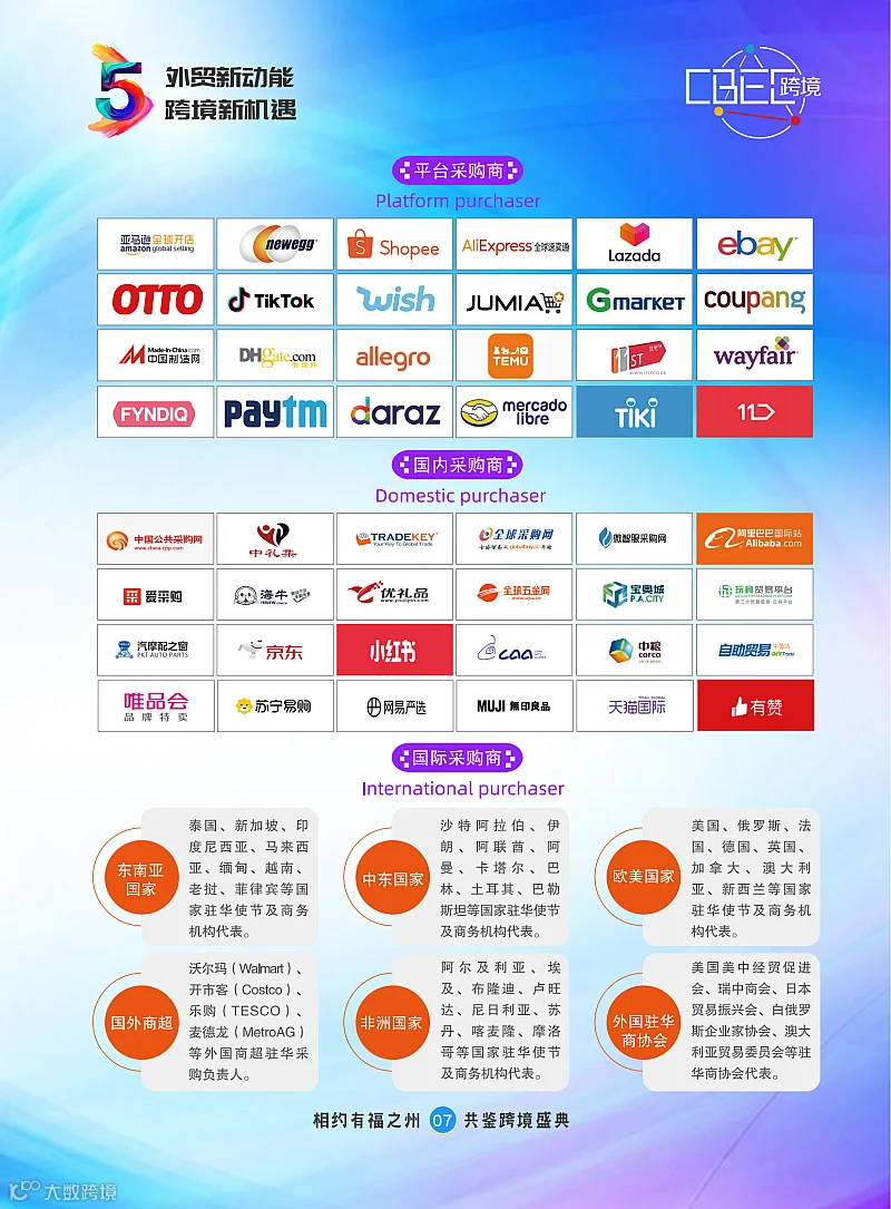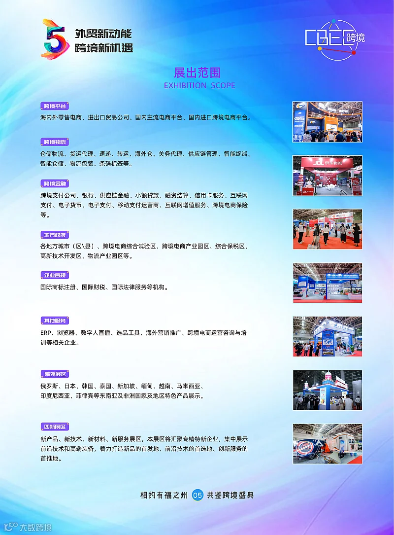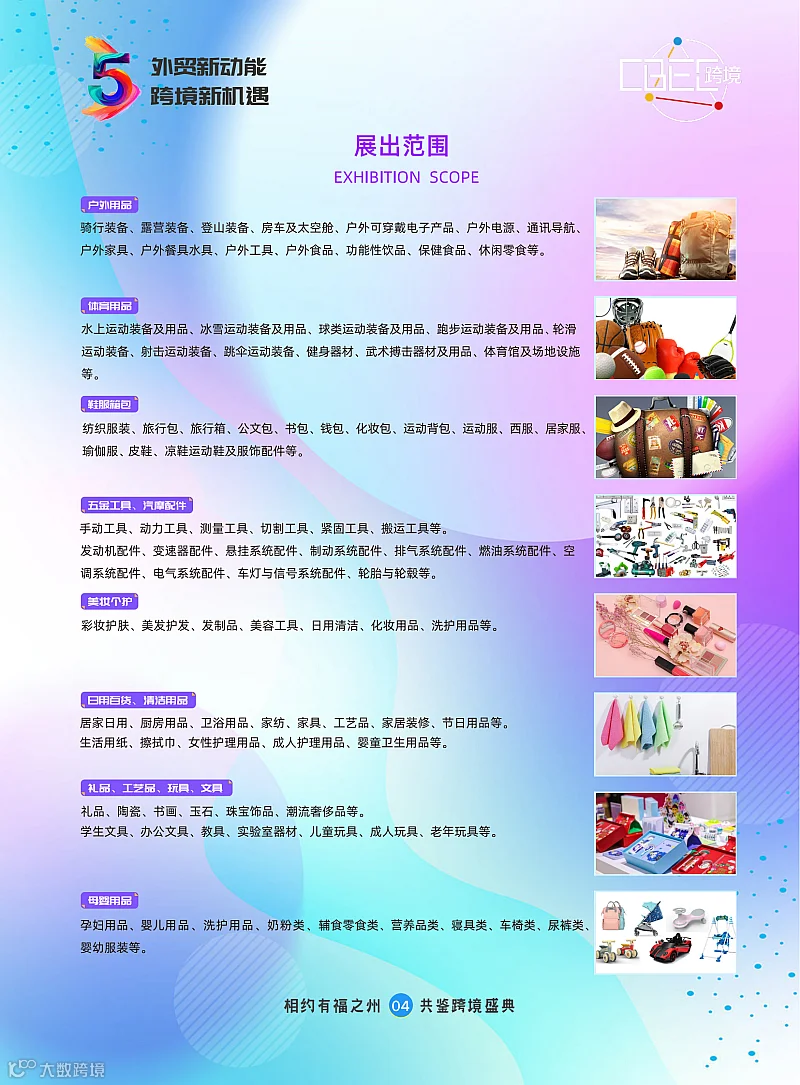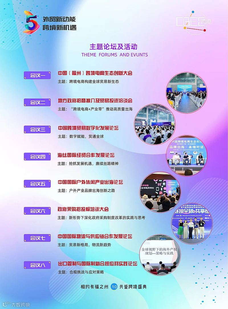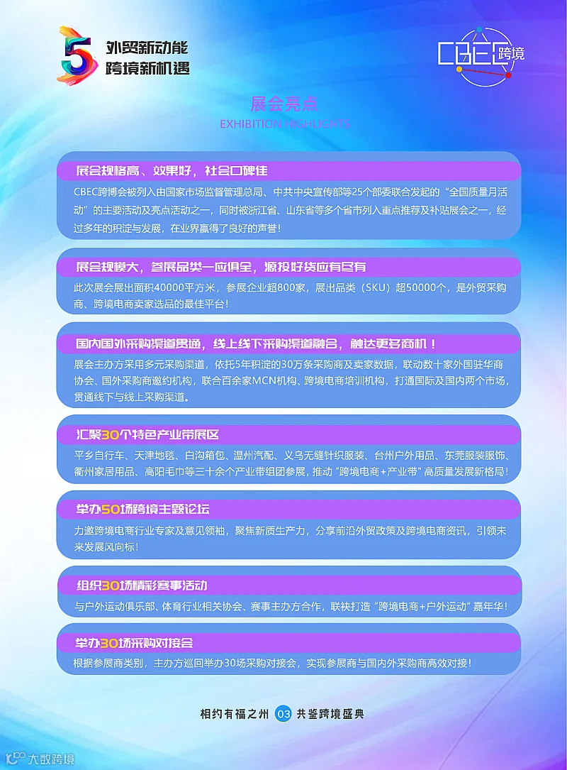 此次展会将以“拥抱数字经济,赋能产业集群;掘金跨境电商·助力品牌出海”为主题,旨在为跨境电商平台、服务商及外贸企业、采购商提供品牌展示、贸易洽谈、采购对接、资源共享为一体的高端交流合作平台。此次展会共设置“八大特色展区”,开设“八大主题论坛”,开展“八大特色活动”,为展商提供“八大尊享福利”,为推动我国跨境电商高质量发展,群策全力、贡献力量。