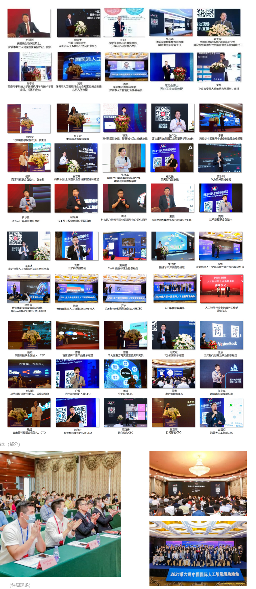 历届大会汇聚各级政府领导、专家学者、人工智能独角兽企业和相关领域企业精英人才。曾邀请Facebook、Google、微软、高通、英伟达、中国移动、华为、腾讯、百度、中兴、360、商汤、HTC、云天励飞等近百家行业龙头企业领袖出席并发表主旨演讲,中科院、清华大学、北京大学、中山大学、暨南大学、深圳大学、南方科技大学等众多专家学者汇聚一堂,凝聚共识,用全新视角透析前沿创新风向。