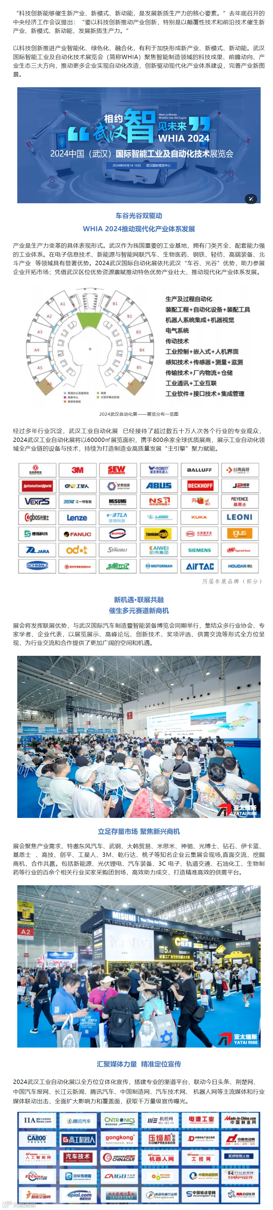 8月14-16日,武汉国际博览中心,2024武汉国际智能工业及自动化技术展览会将聚集众多智能企业、大量意向投资者与企业负责人,汇聚产业、技术、资金与人才资源,联通海内外市场,零距离对接工业自动化产业链发展过程中的贸易合作需求,打造工业自动化领域高效率成交平台。
