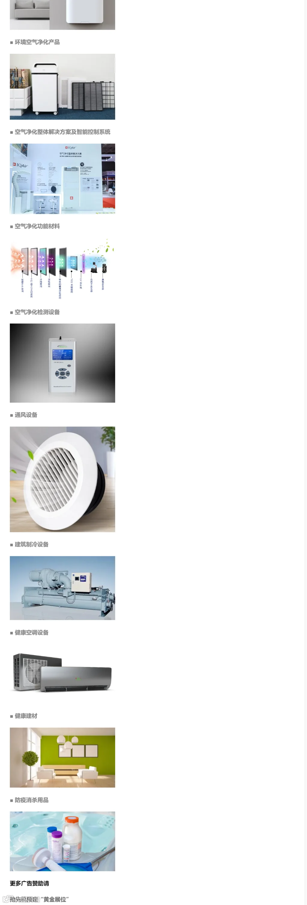 “第三届广州国际环境空气净化及新风系统展览会”集中展示室内环境的技术与产品、空气净化 器(新风机)、污染治理(消杀)、空净检测设备、健康空调、健康厨具、健康照明、健康家居、健康涂 料、健康陶瓷、健康汽车等9大版块新产品、新技术和新成果,品牌企业及赞助商包括中国汽研、海信 空调、海信日立、长虹空调、帅康电器、亿茂环境、垠雨净化、维林诺、松下电器、小米澄一、欧 派、九牧、九溪环保、每刻爱尔、艾恩姆、悦呼吸、爱芯环保、天瑞、中盛陶瓷、尚风科技、九田环 保、英唐智慧、英为拓、金狼电器、优美莱等重磅亮相展会现场。