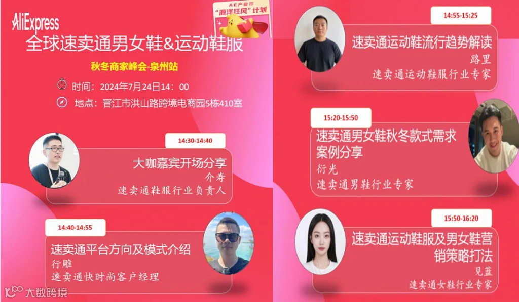 全球速卖通下半年最最最重要的鞋服峰会就在下周三下午14点!放下一切手头事项,带上运营,过来参会!!平台大促核心策略打法,最新营销资源包,秋冬选品等等!杭州鞋服小二全体到场为你答疑解惑!!!时间:7.24 下周三14点地址:晋江市洪山路跨境电商园5栋406室