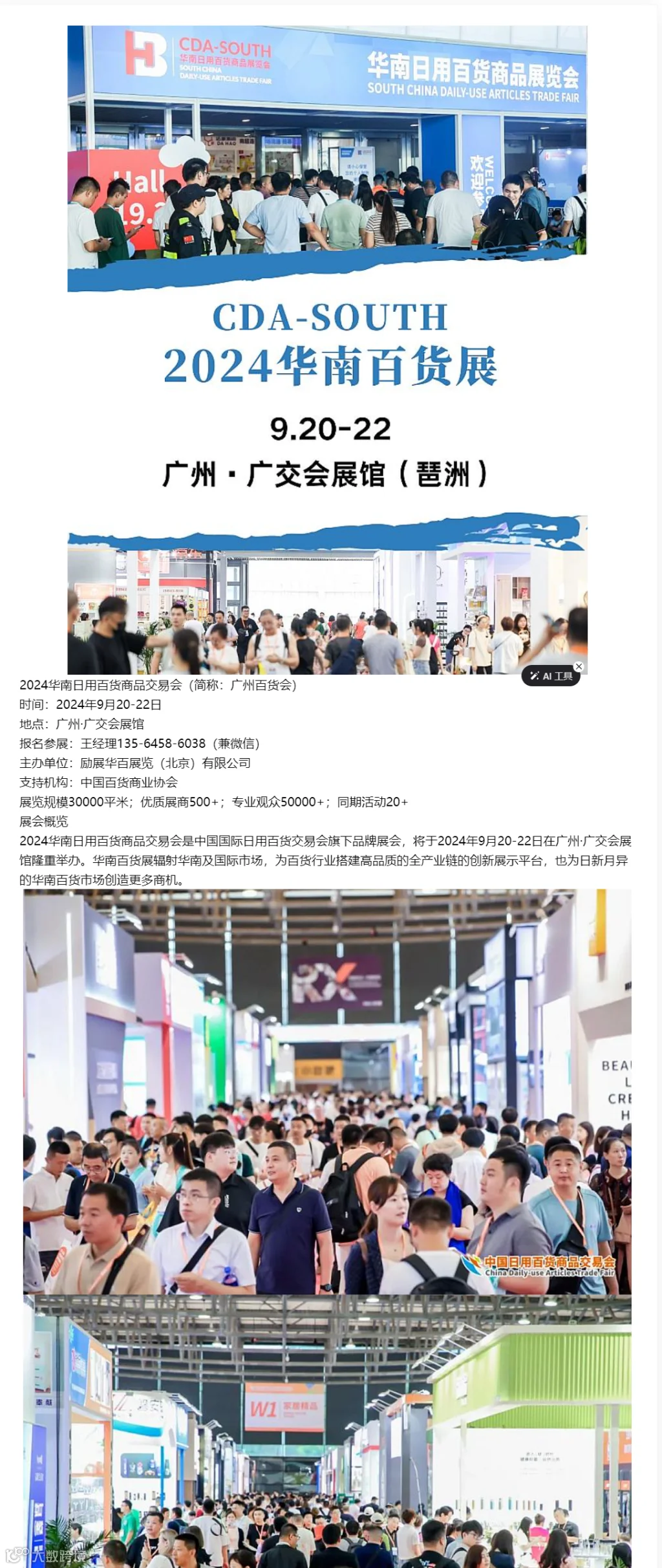 2024年09月20-22 日,CDAS 华南日用百货商品展览会将于广州广交会展馆再度启航!立足日用百货全产业链,聚焦华南、西南及东南亚市场,展现粤港澳大湾区百货市场的潜能和机遇,推动企业开拓商超、电商、外贸、生活馆以及跨境电商等线上线下渠道资源,助力日用百货从业者乘势而上揽获商机。