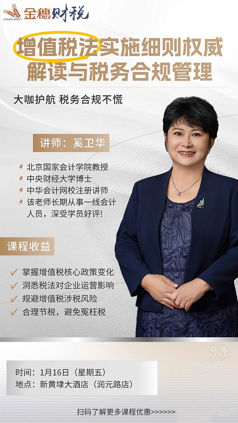 为了帮助广大学员明晰增值税法及实施条例的核心条款与变化要点,助力财税人员准确理解和合规应用新法,有效规避企业的涉税风险,邀请您参加我们举办的“增值税法实施权威解读与税务合规管理”课程。