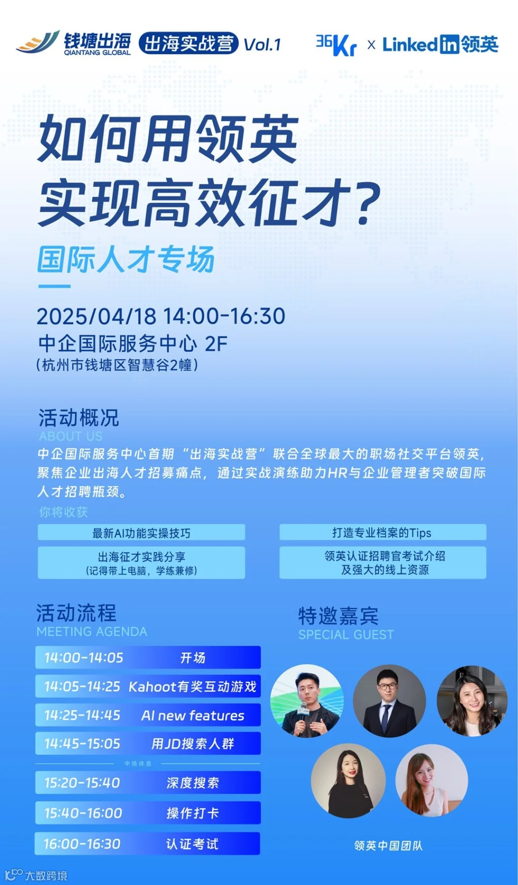 中企国际服务中心将举办“出海实战营”国际人才专场,联合全球最大的职场社交平台领英,聚焦企业出海人才招募痛点,通过实战演练助力HR与企业管理者突破国际人才招聘瓶颈。