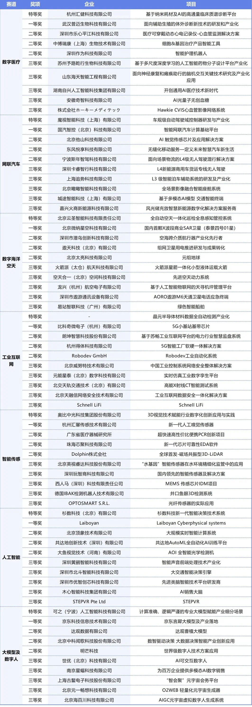 大赛7大专题赛各诞生1名特等奖,杭州汇健科技有限公司的基于纳米耗材及AI的高通量临床质谱诊断平台项目夺得数字医疗专题赛特等奖,魔视智能科技(上海)有限公司的车规级自动驾驶域控制器研发与产业化项目夺得网联汽车特等奖,北京云圣智能科技有限责任公司的全自动空天一体化巡检全息感知管控系统项目夺得数字海洋空天专题赛特等奖,海外项目晶元半导体材料数据全自动检测产业化夺得工业互联网专题赛特等奖,奥比中光科技集团股份有限公司的3D视觉技术赋能行业数字化创新应用与实践项目夺得智能传感专题赛特等奖,杉数科技(北京)有限公司的杉数科技新一代智能决策技术系统项目夺得人工智能专题赛特等奖,可之(宁波)人工智能科技有限公司的计算准确、逻辑严谨的专业大模型赋能产业细分场景项目夺得人工智能(大模型及数字人)专题赛的特等奖,以及7个一等奖项目、21个二等奖项目、35个三等奖项目。