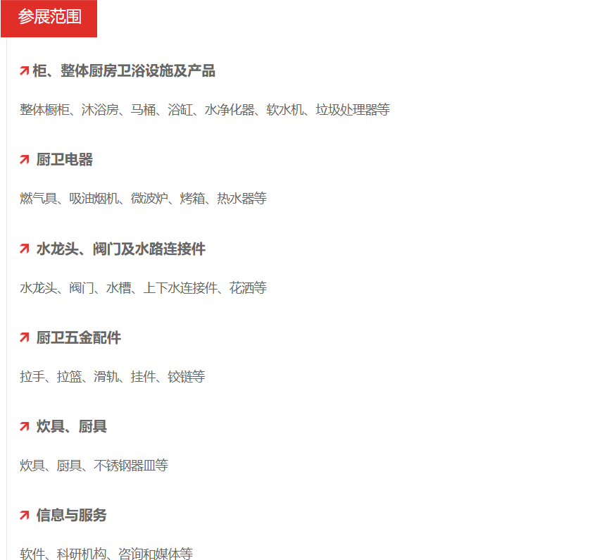 2024中国国际厨卫家居博览会(KIB)展出规模近23,000平米,产品主要涵盖整体厨房、厨电产品、燃气用具、卫生洁具及配件、浴室柜、家居五金等。