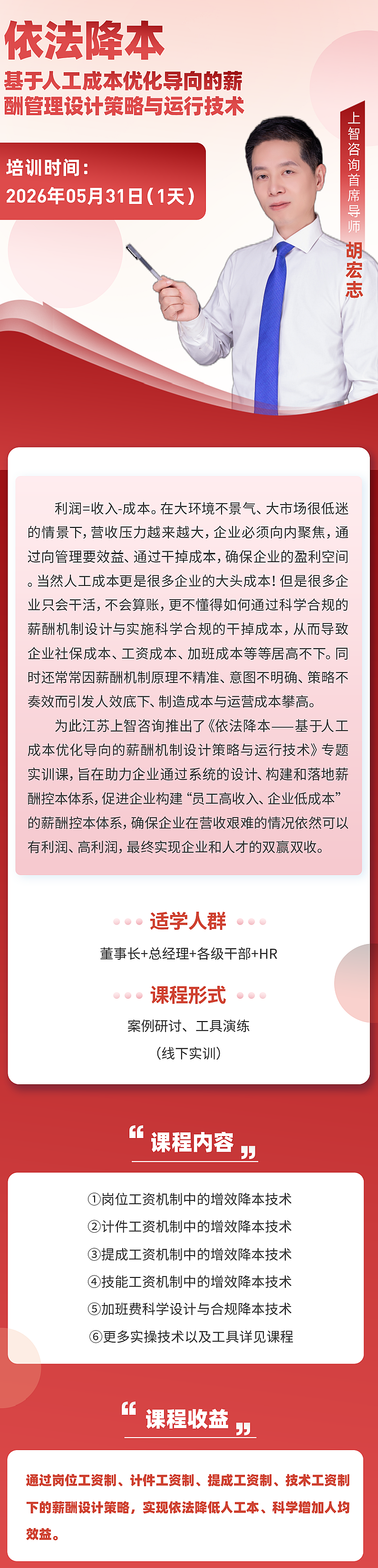 线下实训课:《依法降本——基于人工成本优化导向的薪酬管理设计策略与运行技术》2026.05.31开班