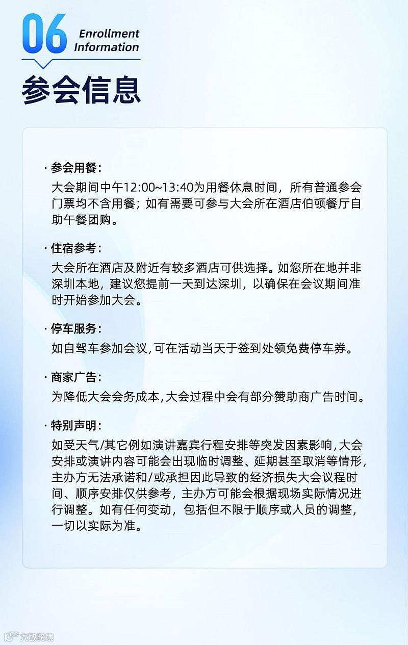 所有参会人员务请自行注意交通出行安全,并需严格禁止醉驾、违反交通安全等不良情形。大会场内人员较多,暂无法一对一安排固定的座位,敬请特别注意个人财物安全,离开座位时物品随身携带,以避免物品遗失或物品损坏。