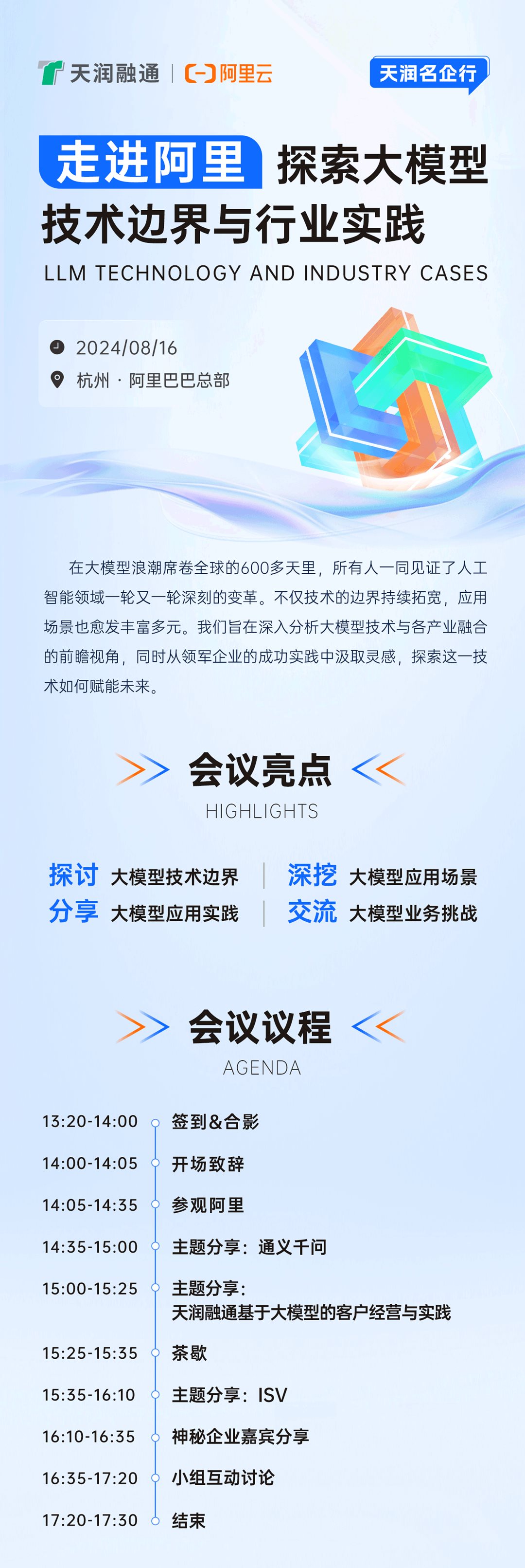8月16日,(周五) 杭州,让我们一起走进阿里集团,探索大模型技术边界与行业实践。