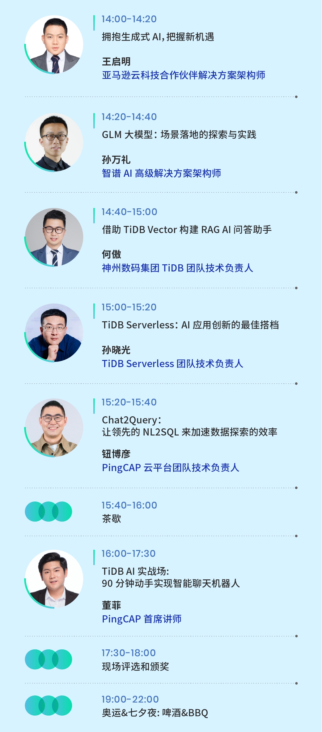 AI 的热潮一浪接一浪,无论是从上至下的战略方向,还是自下而上的内部创新,都离不开 AI 这个火热的话题。北京,一直是 AI 创新的最前沿,创新指数排名全国第一,全球第二。为此,8月10日 TiDB 联合智谱 AI、亚马逊云科技在北京举办一场 AI 实战场。相聚在七夕节的下午和晚上,我们既分享干货,又现场演练,还有聚餐交流,紧张议程中满满的松弛感;即学即用,一招实现智能问答。