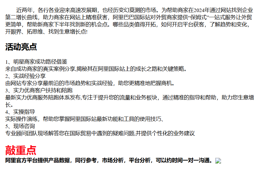 一对一线上线下咨询 - 说明:此活动为阿里巴巴国际站官方直属员工,对深圳正在做跨境电商以及对跨境电商感兴趣的公司或个人,提供产品、国家、平台的数据支持,以及跨境电商的指导和建议。