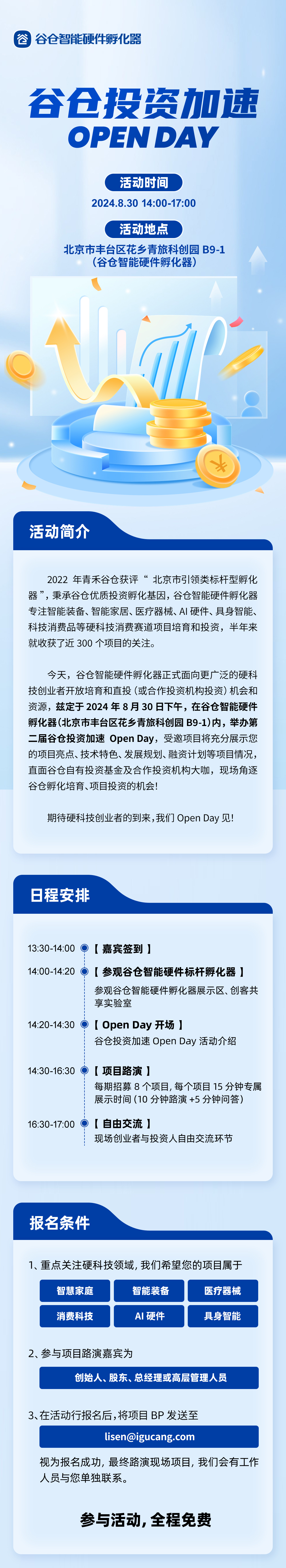 今天,谷仓智能硬件孵化器正式面向更广泛的硬科技创业者开放培育和直投(或合作投资机构投资)机会和资源,兹定于2024年8月30日下午,在谷仓智能硬件孵化器(北京市丰台区花乡青旅科创园 B9-1)内,举办第二届谷仓投资加速 Open Day,受邀项目将充分展示您的项目亮点、技术特色、发展规划、融资计划等项目情况,直面谷仓自有投资基金及合作投资机构大咖,现场角逐谷仓孵化培育、项目投资的机会!