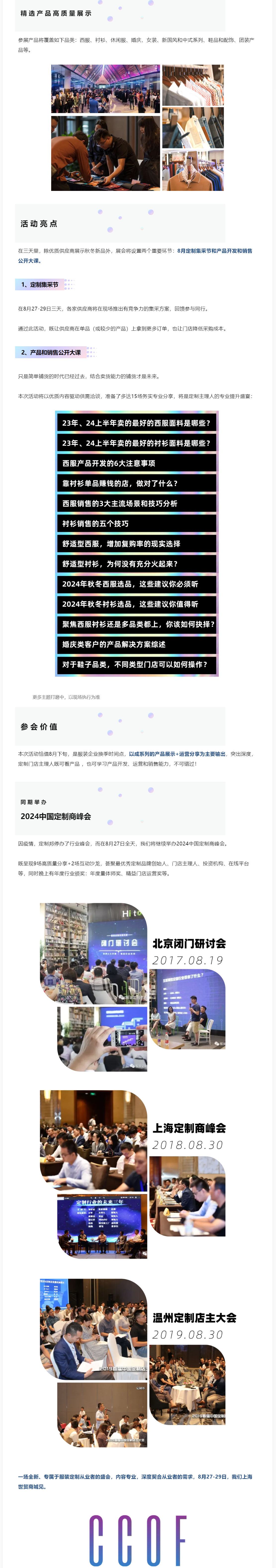 定制邦作为一家深度服务定制行业的公司,为解决此问题,在8月27~29日,将联合真裁实料(上海),协同众多供应链企业,以更深度的方式来展示2024年秋冬新品,输出产品和运营知识,为门店降本增效,欢迎参与。
