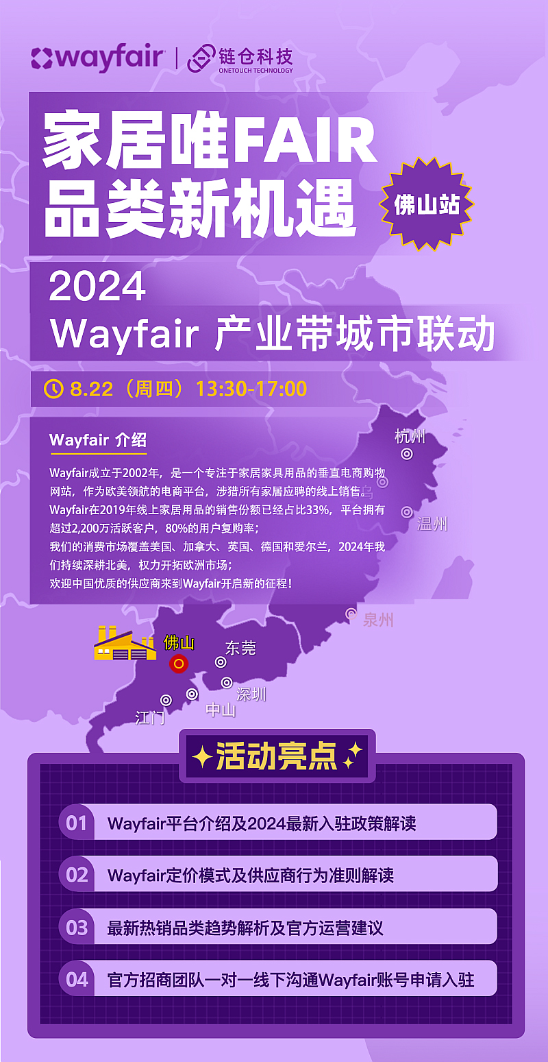 活动亮点Wayfair平台介绍及2024最新入驻政策解读Wayfair定价模式及供应商行为准则解读最新热销品类趋势解析及官方运营建议官方招商团队一对一线下沟通Wavfair账号申请入驻