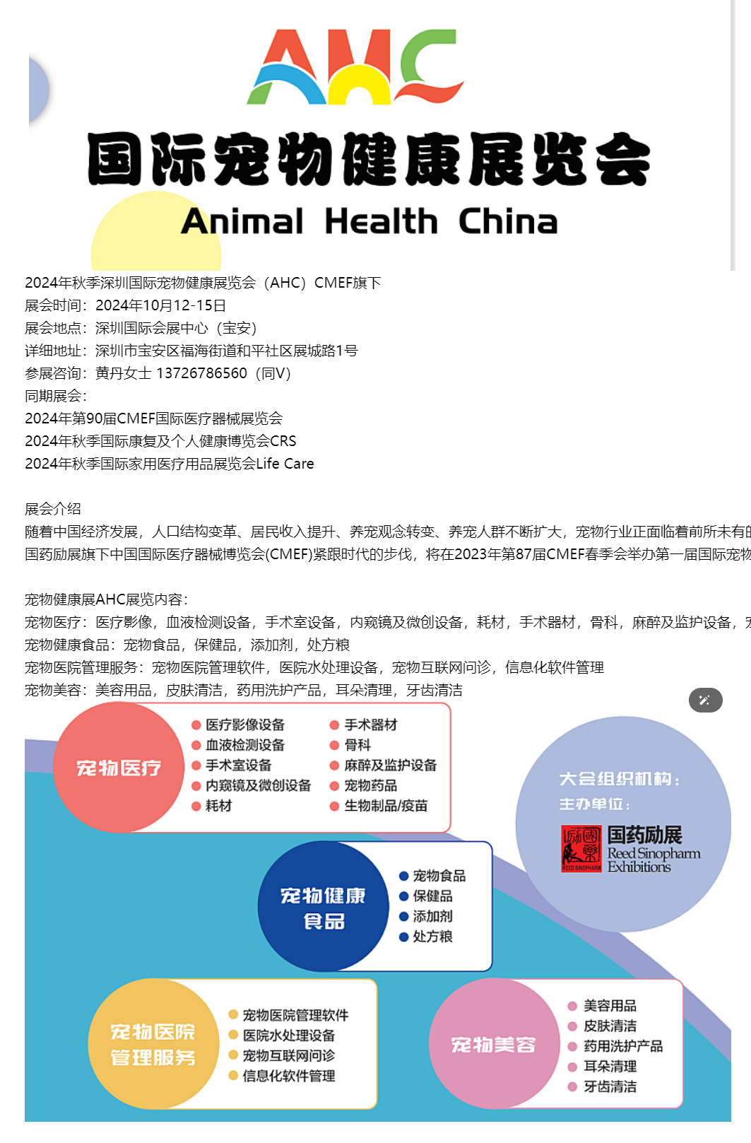 2024年10月12-15日,国际宠物健康展览会(AHC)将于深圳国际会展中心与CMEF同台亮相。