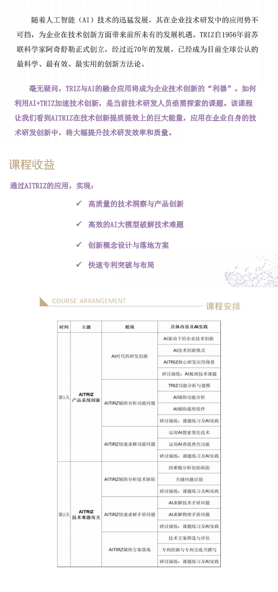 毫无疑问,TRIZ与AI的融合应用将成为企业技术创新的“利器”。如何利用AI+TRIZ加速技术创新,是当前技术研发人员亟需探索的课题。该课程让我们看到AITRIZ在技术创新提质提效上的巨大能量,应用在企业自身的技术研发创新中,将大幅提升技术研发效率和质量。