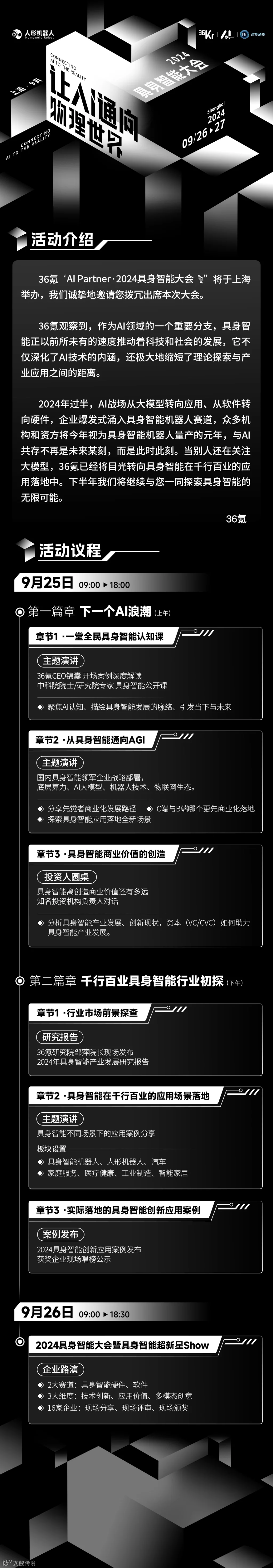 2024年过半,AI战场从大模型转向应用、从软件转向硬件,企业爆发式涌入具身智能机器人赛道,众多机构和资方将今年视为具身智能机器人量产的元年,与AI共存不再是未来某刻,而是此时此刻。当别人还在关注大模型,36氪已经将目光转向具身智能在千行百业的应用落地中。下半年我们将继续与您一同探索具身智能的无限可能。