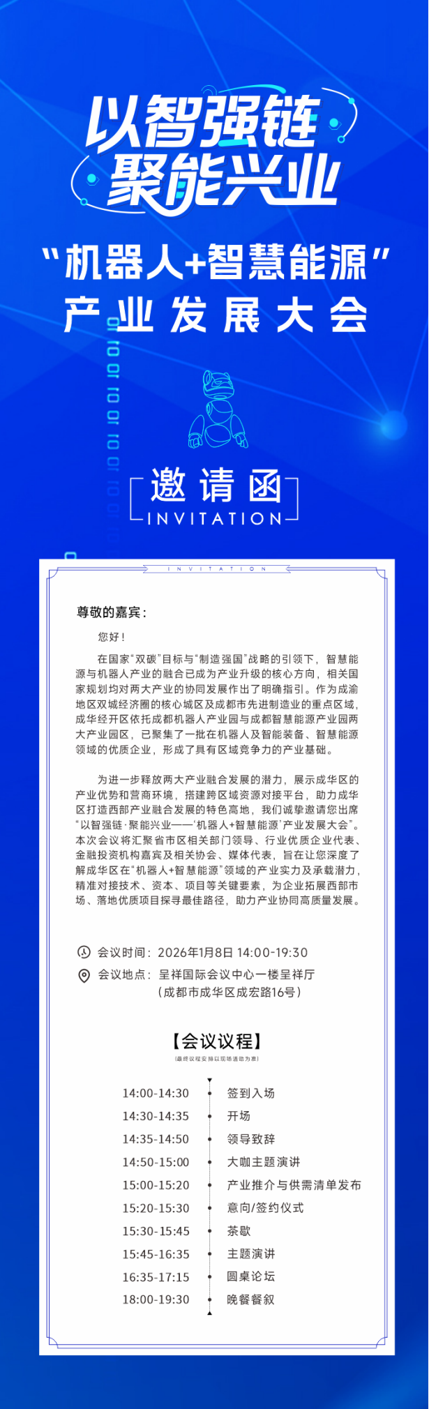 在国家“双碳”目标与“制造强国”战略引领下,智慧能源与机器人产业融合成为产业升级核心方向。成华经开区依托两大产业园区,聚集优质企业,形成产业基础。本次大会旨在释放两大产业融合潜力,展示成华区产业优势和营商环境,搭建跨区域资源对接平台,助力成华区打造西部产业融合发展特色高地。