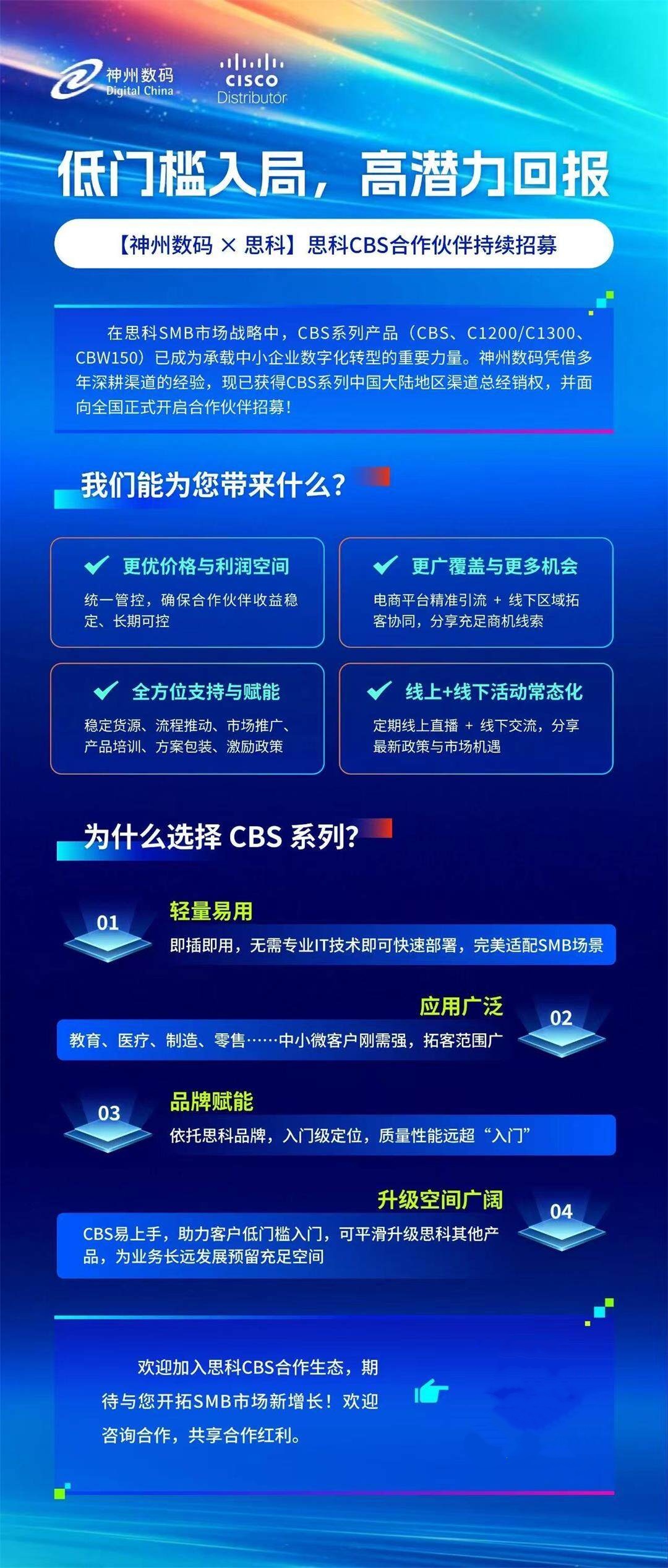 此次我们将深度解读思科 CBS 系列产品 —— 专为中小企业设计的网络解决方案,同时详解区域代理政策与合作红利:您可依托思科前沿技术与强大品牌影响力,背靠神州数码全方位资源支持,借势优质产品与完善保障共享高增长红利。更有深度交流契机助您链接资源、布局新局。