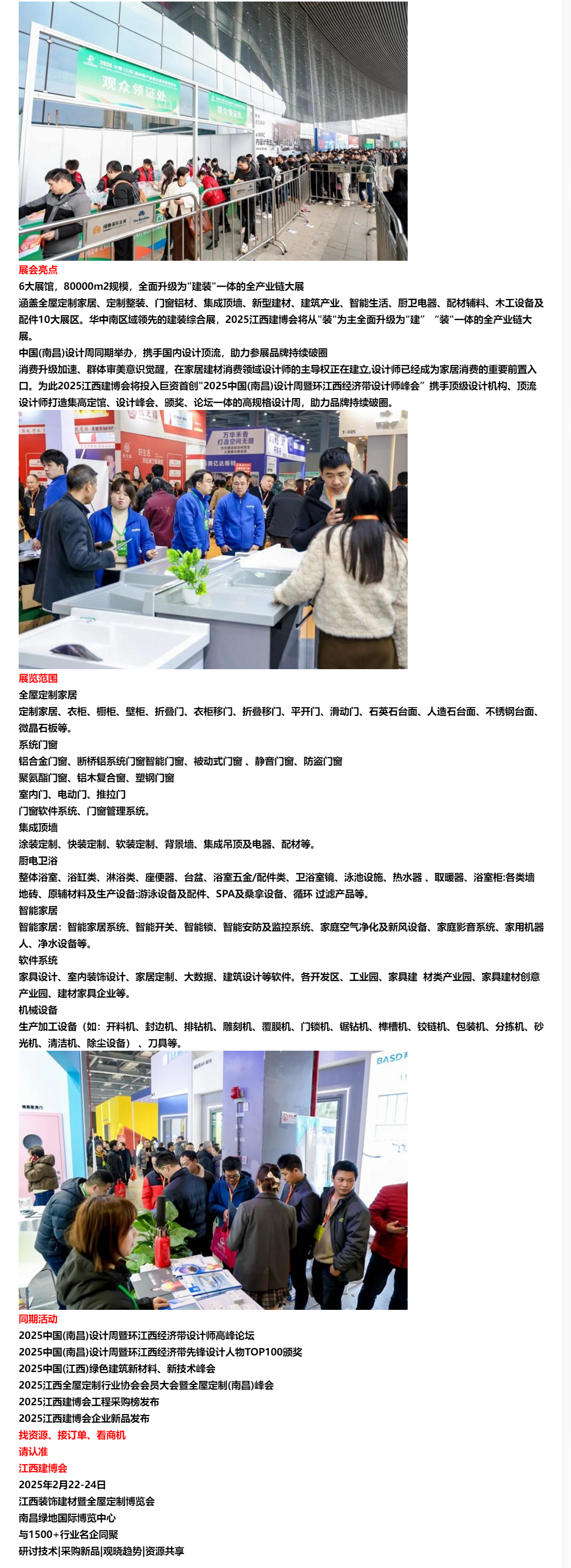 2025中国(江西)装饰建材暨全屋定制博览会,将于2025年2月22-24日在南昌绿地国际博览中心举办。预计展会规模80000平方米,将展出定制家居、门窗、全屋整装、五金板材/集成顶墙/卫浴/、智能家居/厨电/木工设备及配件,同期将举办超过30场次的各类峰会、论坛、讲座等活动。预计参展企业将超过3000+家、参会观众将达80000+人次。