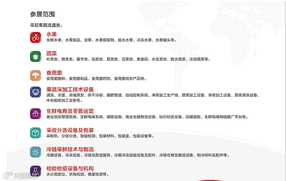 中国(上海)国际果蔬博览会专注于新鲜果蔬领域的贸易对接和产品技术展示,立足以中国主要消费市场为中心。同时汇集国内外水果区域公共品牌、各省市县政府、行业协会等行业精英。凭借往届成功运作积累了庞大的全球买家资源库,另外,得益于展会深耕全国销售网络,届时具有大宗采购意向的优质果蔬经销代理商、贸易商、零售商、电商、连锁商超、酒店餐饮等买家将到场,与企业进行商务洽谈。同时,展会还聚合了电商、社群/社区零售、微商、加盟商等新式零售渠道,线上线下齐发力为企业全方位、多层次拓宽销售渠道。
