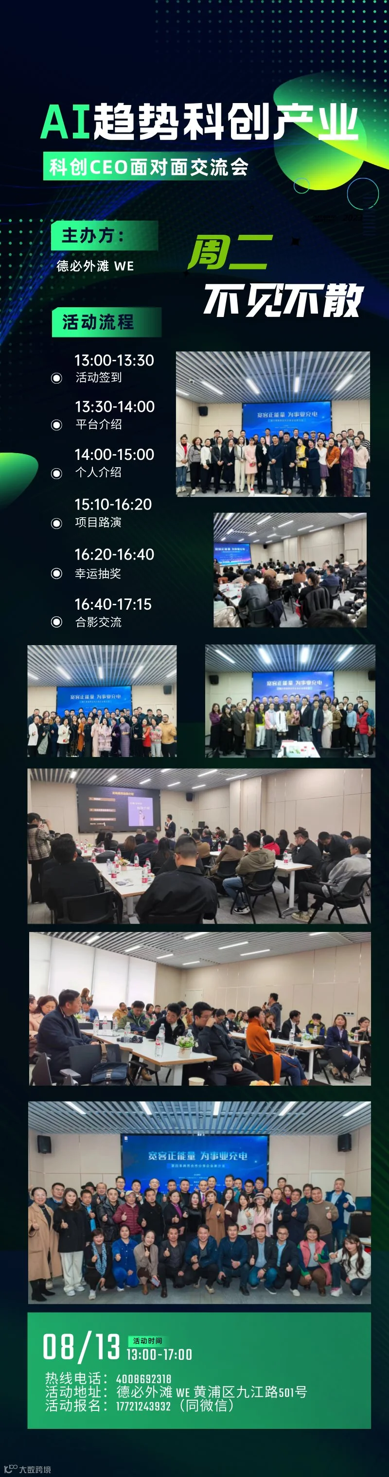 AI趋势科创产业科创CEO面对面交流会8月13日13:00-17:00德必外滩 WE 黄浦区九江路501号支持单位:重壹家办|繁花联盟|加杰咨询|代代富财商|天空资本|works999 |久中律所 |工商银行创新中心|小红书|月酋文酒业|灸合知识产权主办方:德必外滩