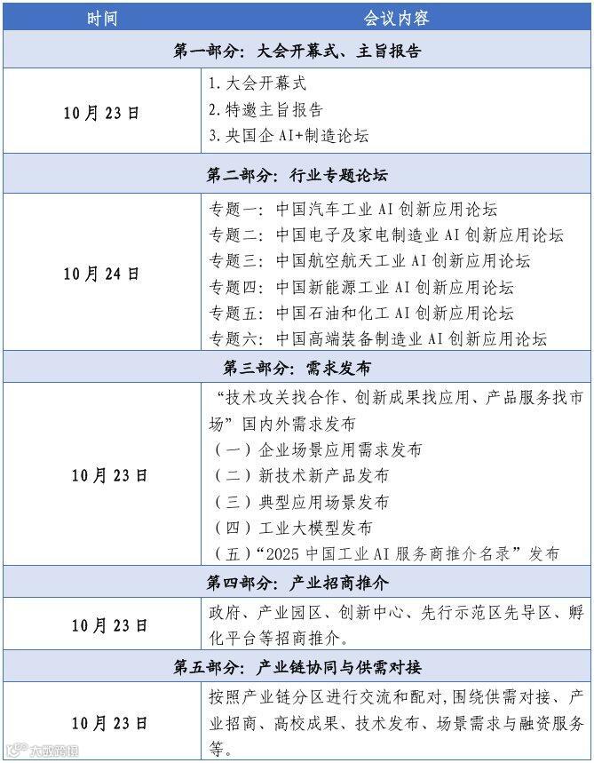 推动技术创新与突破:汇聚产学研用各方力量,深入探讨工业 AI 前沿技术,加速核心工业级芯片等关键核心技术攻关,突破技术瓶颈,形成自主可控的人工智能技术体系。促进产业深度融合与协同发展:搭建交流合作平台,推动工业 AI 技术与制造业各环节深度融合,助力企业通过数据共享和产业协同变革生产组织方式,创新产品形态。发布典型应用场景:大会将征集并发布人工智能赋能新型工业化的典型应用场景,为工业人工智能应用提供宝贵经验。为科研院所和高等院校在人工智能、大数据、大模型研究成果提供技术发布、成果转化、成果展示。深化产业链协同与供需对接:大会设有需求发布和供需对接活动,将发布智能制造、生产管理、工艺设计、检测、运维等领域的应用需求,为人工智能赋能新型工业化提供供需对接服务平台。