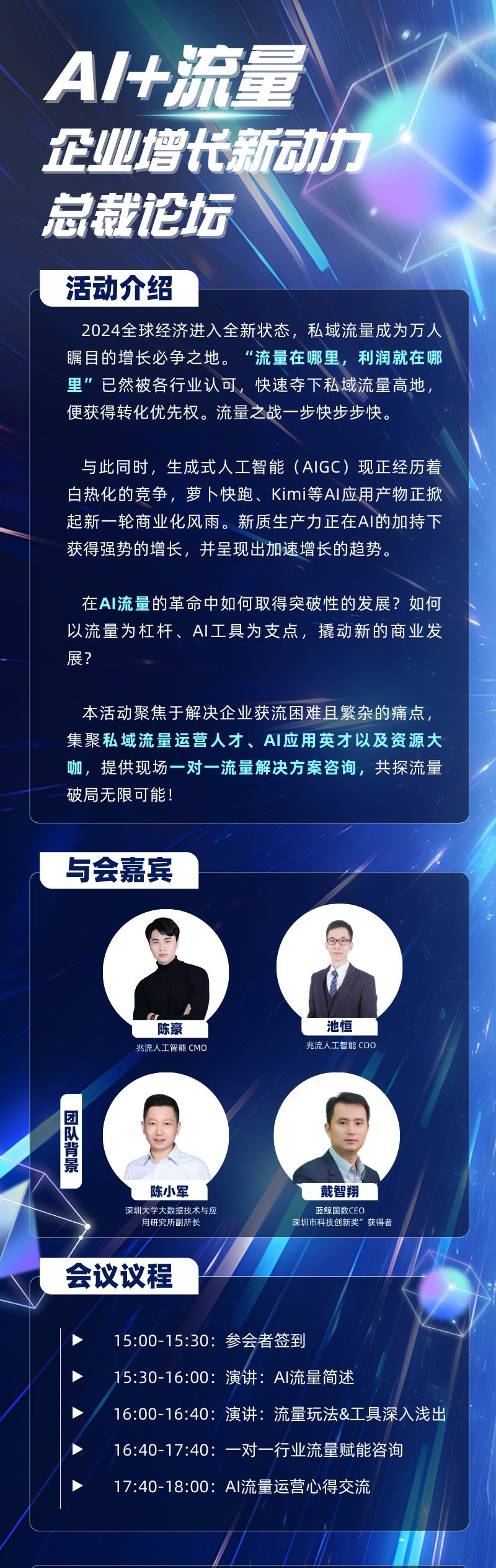本活动聚焦于解决企业获流困难且繁杂的痛点,集聚私域流量运营人才、AI应用英才以及资源大咖,提供现场一对一流量解决方案咨询,共探流量破局无限可能!