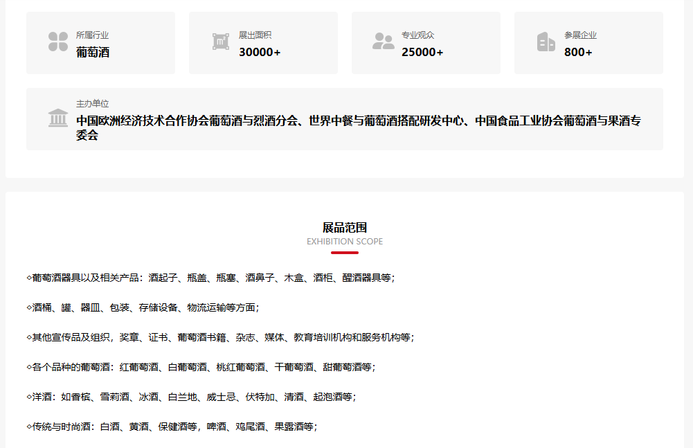 广州国际高端烈酒及啤酒展览会HIGN-END WINE以“品世界红酒,享受美酒生活”为主题。2010年以来积累了90多个酒类生产国际相关组织资源,3万多家酒庄和进口商,近10万个经销商;历届展会共吸引了来自法国、西班牙、意大利、澳大利亚、美国、德国、葡萄牙、罗马尼亚、阿根廷、南非、智利和格鲁吉亚等50多个国家的近3000家企业参与,总展出面积达200,000平方米,其中68%为国外酒庄。